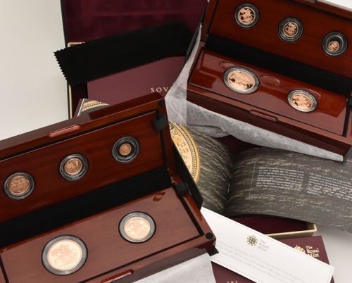 Each of the two coin sets consist of a quarter-sovereign, half-sovereign, sovereign, double-sovereign and five-sovereign piece