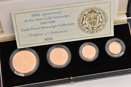 The collection consists of a half sovereign, sovereign, double-sovereign and five-pound coin, limited edition number 0521 of 5000, struck in 22ct gold, in proof condition with original display box and paperwork.