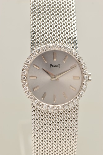 The watch has a screw-down caseback and is fitted with an integrated mesh bracelet with folding clasp stamped 750 and signed Piaget.