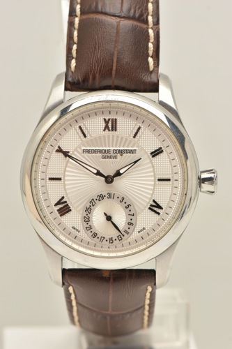 The 42mm stainless steel case has a display caseback exhibiting the in-house developed 26 jewel FC-700 automatic movement.