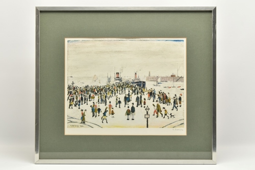 A signed limited edition print depicting figures waiting to board ferries. Signed with a blind stamp to lower margin, published 1972 by Venture prints from an edition of 500, approximate size 34cm x 42cm including visible margins.